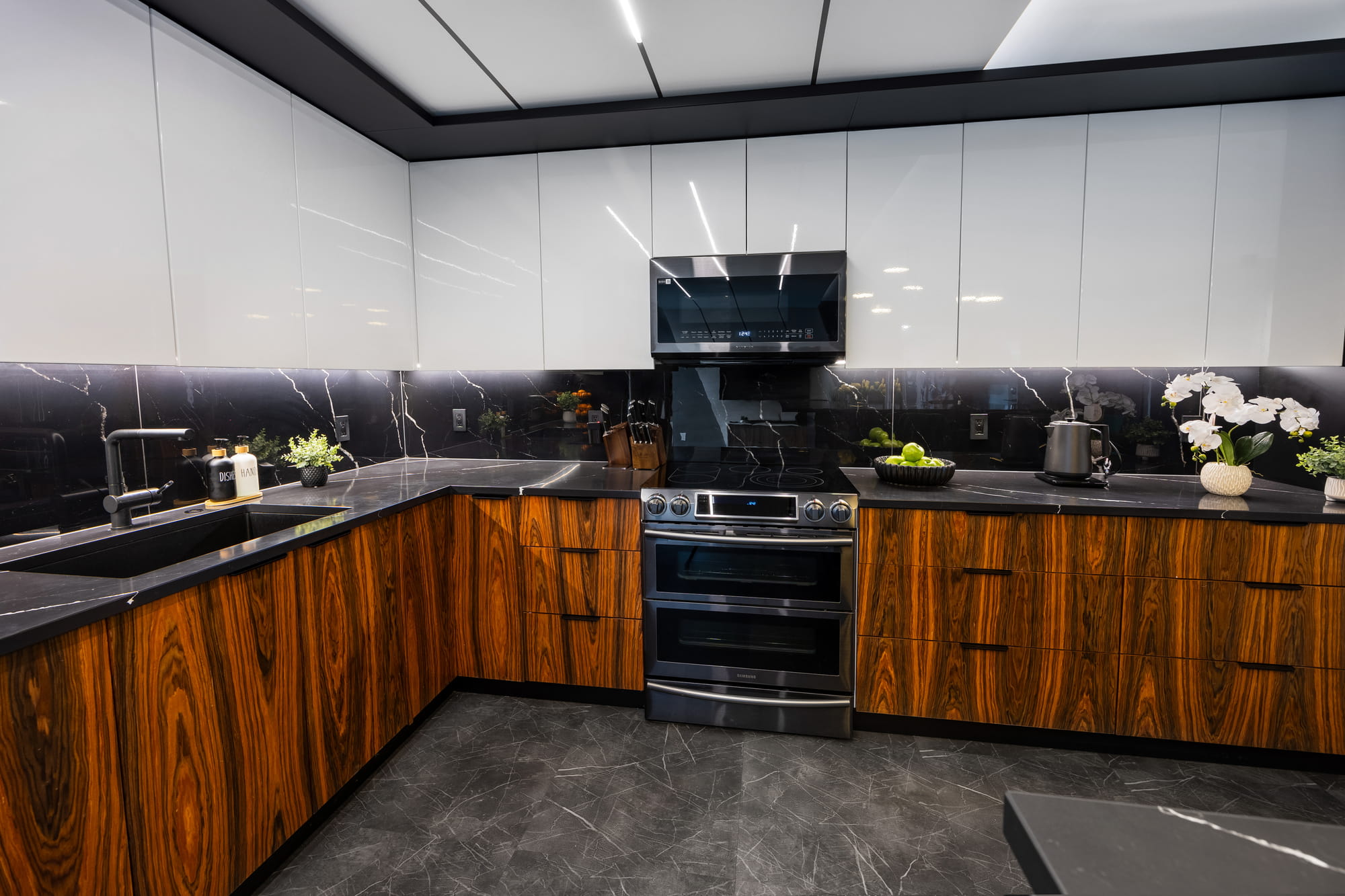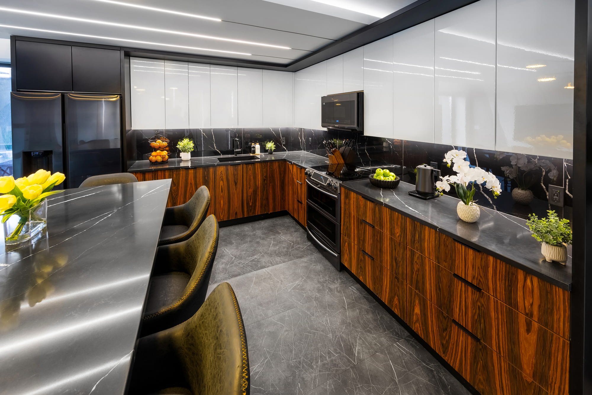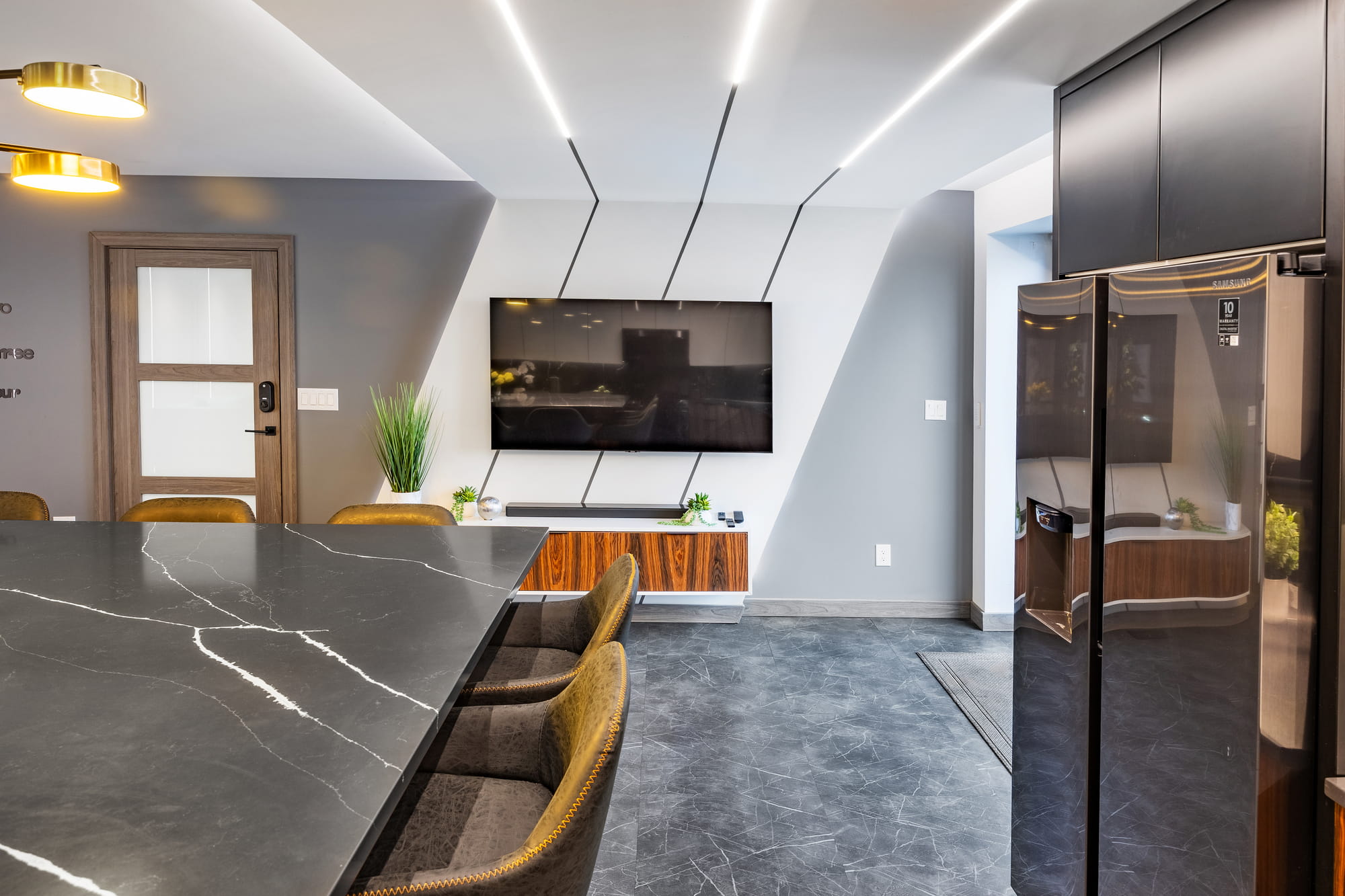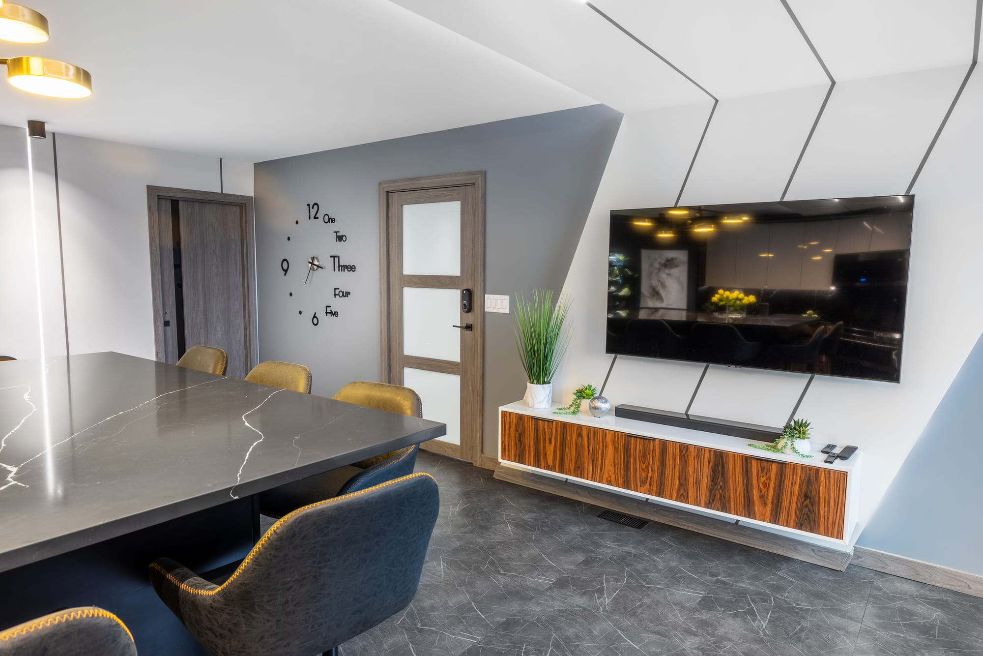 This project involved a complete renovation of a kitchen and open-concept living area, transforming the space into a modern, functional, and visually cohesive home environment. The layout was carefully designed to create a seamless flow between the kitchen, dining, and living areas, enhancing both usability and comfort. At the center of the space is a custom-designed kitchen featuring high-gloss cabinetry paired with rich natural wood finishes and premium countertops with waterfall edges. A large central island provides additional workspace and seating, making it ideal for both daily use and entertaining. Modern appliances and integrated storage solutions were incorporated to maintain a clean and streamlined appearance. Extensive custom millwork was implemented throughout the space, including built-in cabinetry and a custom media wall, adding both functionality and a refined design element. Special attention was given to lighting, with integrated linear LED systems and statement fixtures that highlight architectural features and create a warm, modern atmosphere. Every detail — from layout planning to final finishes — was executed with precision, resulting in a sophisticated and highly functional living space tailored for modern living.