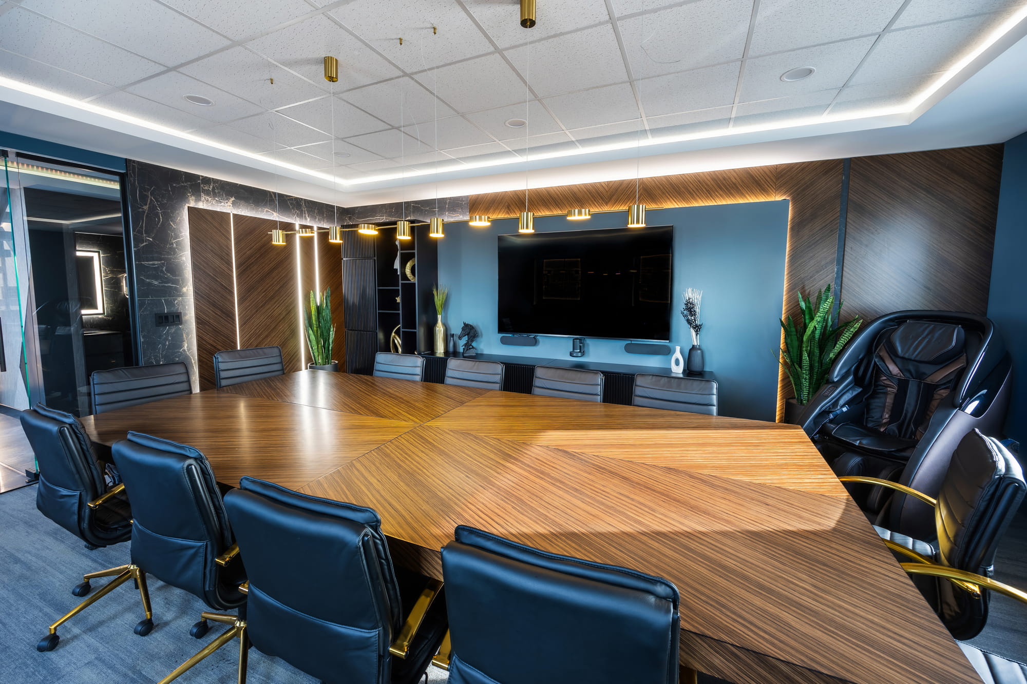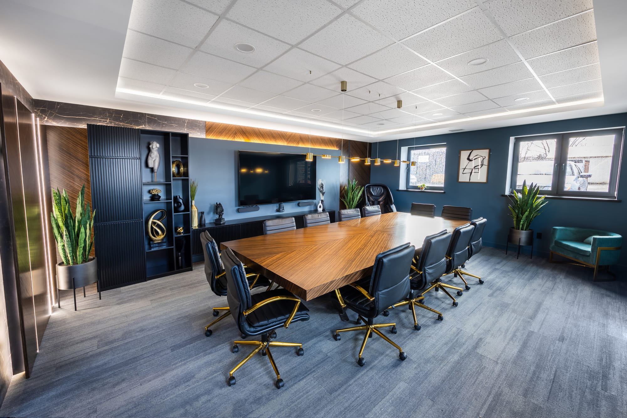 This project involved a complete transformation of an office space into a modern, high-end working environment tailored for meetings, collaboration, and executive use. The layout was designed to maximize efficiency while maintaining a clean and visually cohesive look. At the core of the space is a custom conference area featuring a large statement table with premium wood finishes and ergonomic seating, creating a strong focal point for meetings and presentations. The design emphasizes both functionality and comfort, supporting daily operations as well as formal gatherings.